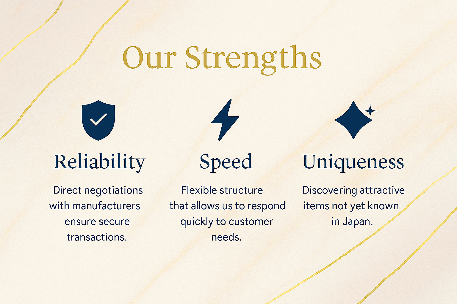 メーカーと直接やり取りを行い、品質・デザイン・価格に優れた商品を厳選。小規模ながらも柔軟でスピーディーな対応を強みとし、海外メーカーと日本のお客様の架け橋となります。